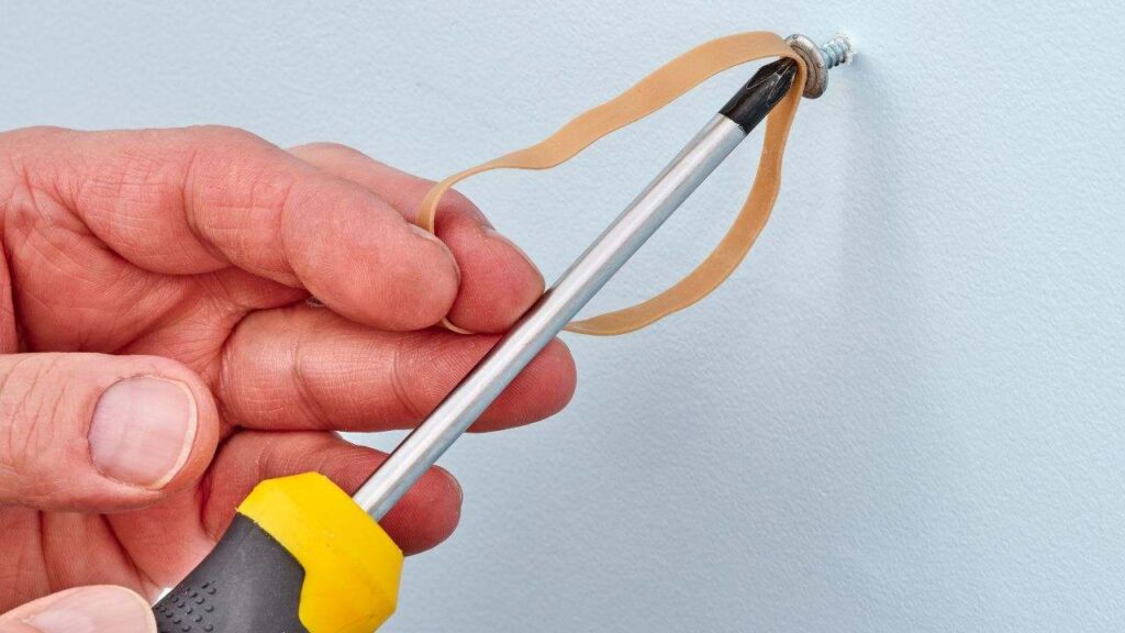 Placing a rubber band over the screw head adds extra friction between the screw and the screwdriver.