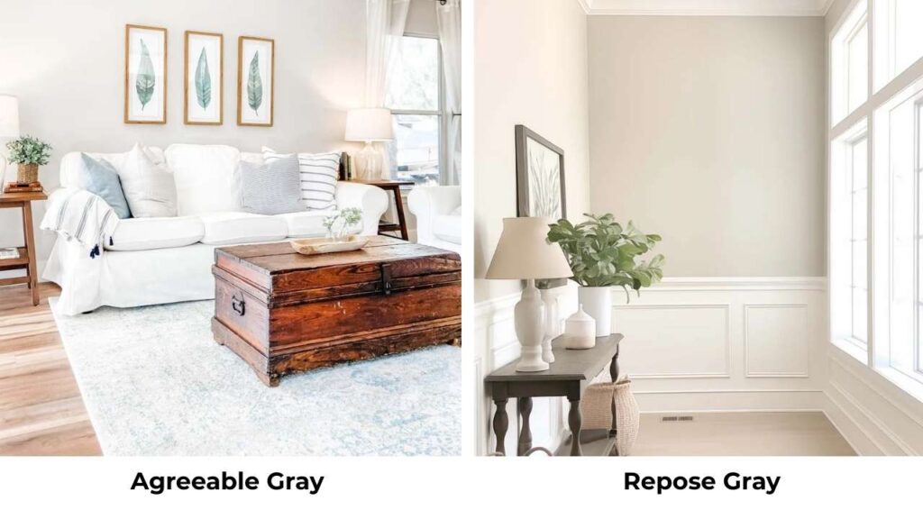 This is a common comparison. Repose Gray (LRV 60) is grayer with visible blue and green undertones compared to Agreeable Gray’s warm greige.